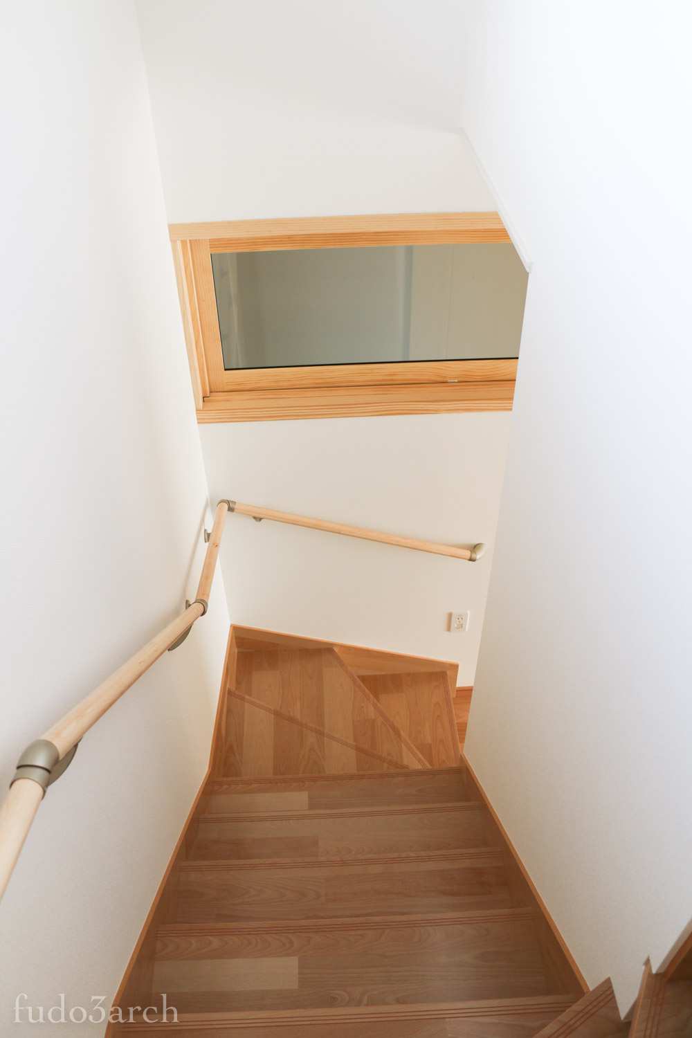 2階や階段からも玄関の出入りの様子がわかる。それだけでなく室内に取り込んだ光を暗くなりがちな玄関へ運ぶ役割も担っています。
